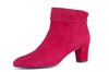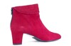 Strak gesneden enkellaarsje op hakje van 6 cm met omslag die ook omhoog gedragen| kan worden. De rits loopt achter over de hiel, in zwart suède, in rood suède en| in donkerblauw leer met broque print.|