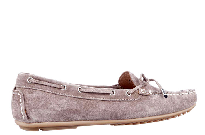 De echte lichtgewicht moccassins op noppenzooltje met veter door het boord en vetertje op het voorblad. In diverse kleurrijke uitvoeringen: camel-, taupe-, oranje-, babyblauw- en donkerblauw suède, goud leer en met wit/zw en zw/wit print. Loopt heerlijk met blote voeten.