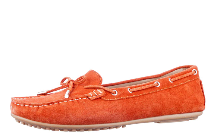 De echte lichtgewicht moccassins op noppenzooltje met veter door het boord en vetertje op het voorblad. In diverse kleurrijke uitvoeringen: camel-, taupe-, oranje-, babyblauw- en donkerblauw suède, goud leer en met wit/zw en zw/wit print. Loopt heerlijk met blote voeten.