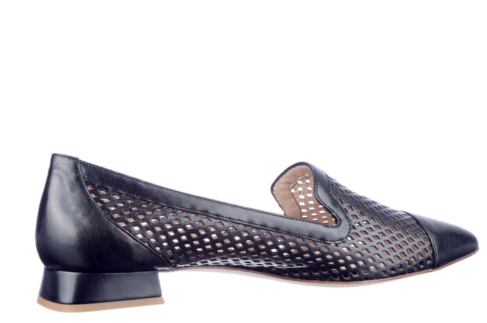 Elegante instapper op spitse leest en met laag bekleed trapeze hakje. De basis van het ontwerp is tijdloos klassiek maar de twist maakt het allerminst saai. Plat en elegant, in een actuele kleur oranje roest nubuk en in zwart leer.