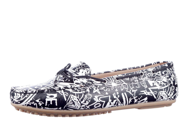 De echte lichtgewicht moccassins op noppenzooltje met veter door het boord en vetertje op het voorblad. In diverse kleurrijke uitvoeringen: camel-, taupe-, oranje-, babyblauw- en donkerblauw suède, goud leer en met wit/zw en zw/wit print. Loopt heerlijk met blote voeten.