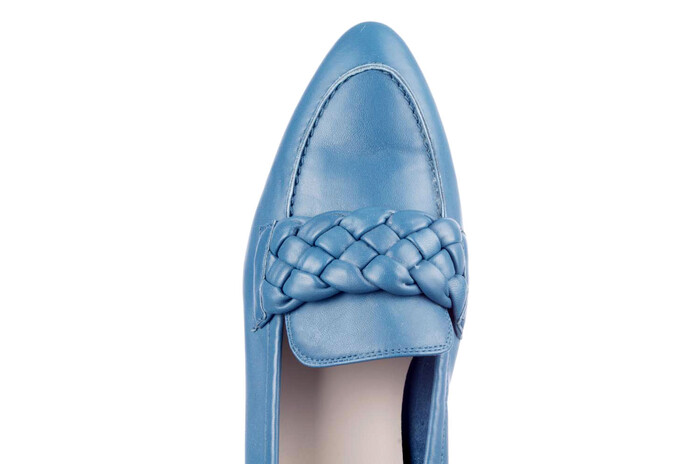 Chicque / Sportief / Casual ? het kan allemaal met deze instapper uitgevoerd in rijke petrolkleur met gevlochten band over de voorvoet. Donkerblauw is de standaard maar deze blauwe kleur is ook heel goed te combineren met allerlei natuurkleuren, groen, oker en goud. De instap is met elastiek afgewerkt en sluit mooi aan.