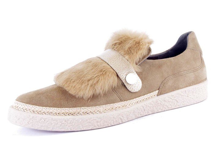 Comfortabele instapper met verwisselbaar comfort voetbed. Uitgevoerd in camel| suèdeen mooi afgebiesd met sisal langs de zool. Op het voorblad een| bontapplicatie die met drukknopen bevestigd is en dus makkelijk losgemaakt kan| worden. Ook in zwartcombinatie.|