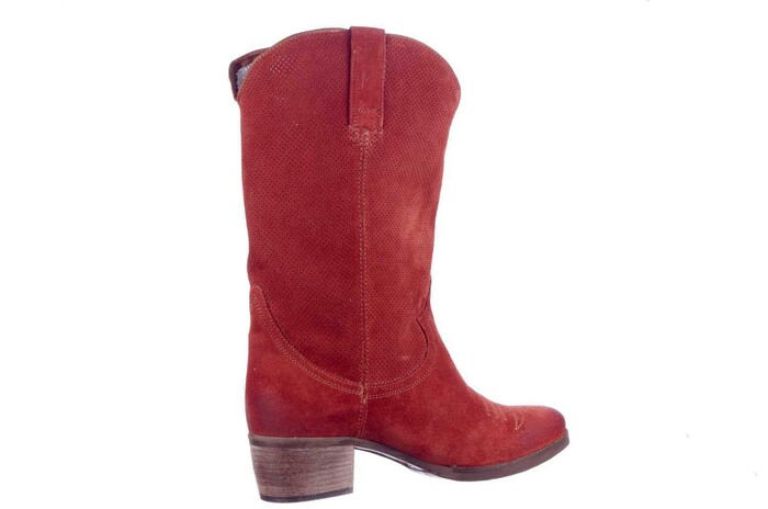 Westernlaars met karakteristiek stikwerk en schuine hak van 4 cm. De schacht is| geperforeerd en het suede stoer gefinished. De punt en de hak zijn iets minder| spits maar dat loopt wel zo prettig. Als kuitmodel in oranje- en lichtblauw| suede en als enkellaars in beige-, olijf-, cognac- en zwart suede.|