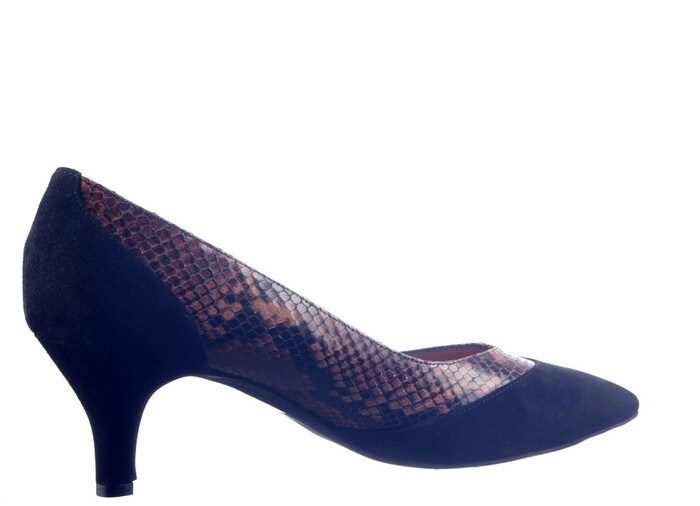 Elegant retropumpje op queeniehak van 3,5 cm in geraffineerde uitvoering van| zwart suede met bruin python leer. Combineert heel mooi met zwart/bruine| kleding. De spitse leesten komen weer terug en er is ook nog een variatie met| hoger gesloten front. "Quality never goes out of style" is het motto van ons| private label. Het bijpassende tasje maakt uw outfit compleet.|