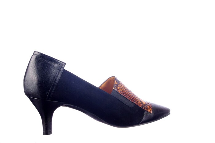 Elegant retropumpje op queeniehak van 3,5 cm in geraffineerde uitvoering van| zwart suede en zwart leer met bruin python leer. Combineert heel mooi met| zwart/bruine kleding. De spitse leesten komen weer terug en er is ook nog een| variatie met lagere uitsnede. "Quality never goes out of style" is het motto van| ons private label. Het bijpassende tasje maakt uw outfit compleet.|