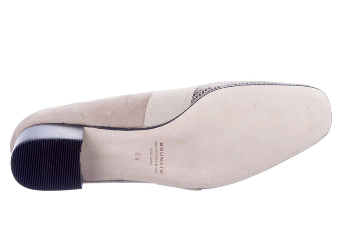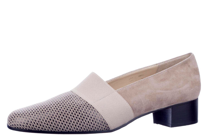 Klassieke pump op hakje van 2 cm uitgevoerd in beige suède. Op het voorblad met een subtiele grafische print en afgebies met beige elastiek. Dit model sluit heel mooi aan de voet en biedt tijdloze elegantie.