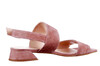 Deze platte dubbele bandsandeel is dit seizoen op carréleest met laag trapeze hakje van 2 cm uitgevoerd. Trendy en stijlvol met een klassieke touch uit de Italiaanse school. We kozen voor twee subtiele kleuren suède: salvia groen en oud roze, maar ook de klassiere variant in donkerblauw  leer met klein printje is fraai.