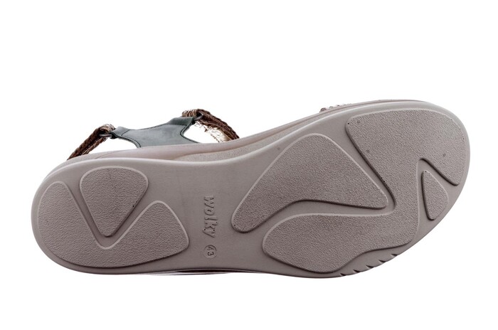 Hoewel het merk Wolky doet denken aan het Engelse ‘walk’ (to walk = lopen) was dat niet de reden om voor die naam te kiezen. De oprichters zochten in 1982 de associatie met de Nederlandse wolken; zodra je een paar aantrekt loop je op en in de wolken. Om dat gevoel te bereiken zijn de voetbedden volgens anatomisch ontwerp samengesteld uit memory foam, natuurlijke kurk en een leren toplaag. De leesten zijn kenmerkend rond, gezwaaid gevormd en laten voldoende teenruimte. De meeste onderwerken lopen door en bieden veel demping maar er zijn ook modellen op stevige hakken tot 4,5 cm. De ontwerpen zijn eigenzinnig met een knipoog naar fashion. Inmiddels is het een wereldwijd verkocht merk dat nog steeds in handen is van de familie. Deze sandaal met driedubbele klitteband in de natuurtinten groen en cognac heeft wat dunnere bandjes. De zon kan gaan schijnen.