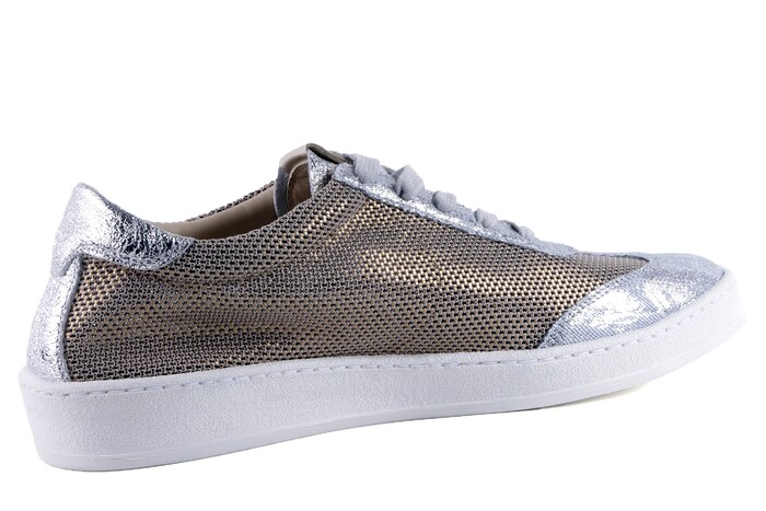Op tennisschoen geïnspireerde sneaker uitgevoerd in opengewerkt canvasmateriaal;| afgewerkt en gevoerd met leer; de blingmode van dit voorjaar wordt in deze| metallic uitvoering door Donna Carolina weer eigenwijs gevolgd en wij zien dit| helemaal voor ons onder skinny jeans of wijdvallende zomerbroeken; in| witzilveren en in brons/camelzilveren uitvoering.|
