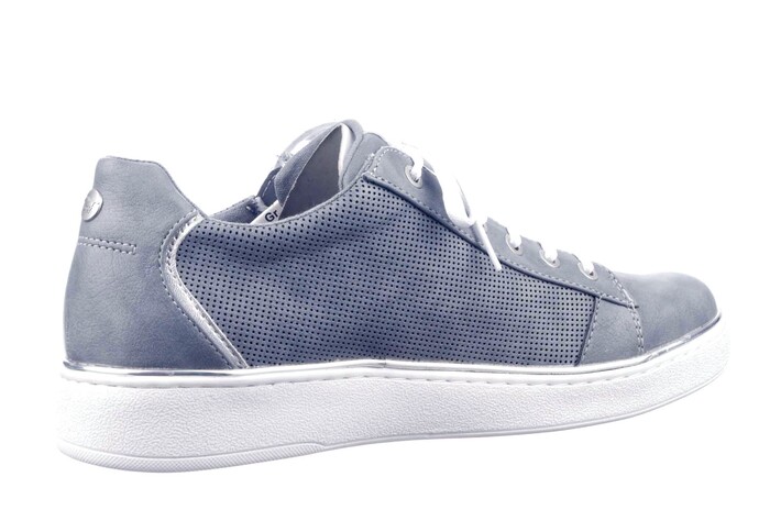 Basic sneaker van Mustang in diverse trendy uitvoeringen: een wit model| verfraaid met zilveren details en perforaties, rits langs de veter voor| makkelijke instap. Dit model is er ook in wit en in een jeans uitvoering.|
