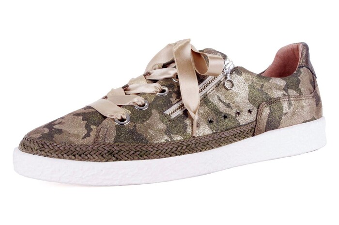 Soft sneakers op sportieve en verende sportzool in diverse natuurtinten. Met| decoratieve lintveter en rits opzij voor makkelijke instap. Er is een versie in| groen metallic camouflage en in beige suède. Op deze leest is er ook een| driedubbele klittebandsneaker in brons leer. Alle modellen met verwisselbaar| voetbed.|