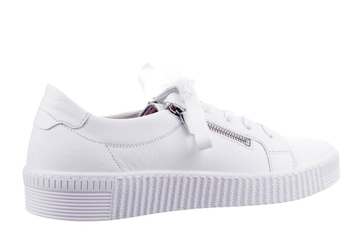 Gabor is een familiebedrijf uit Zuid-Duitsland en al sinds 1949 een toonaangevende schoenfabrikant. Zij bieden een onwaarschijnlijk brede collectie van allerlei modellen waarvan de meeste modellen tot maat 43,5 en een aantal series tot maat 45 lopen. Gabor hanteert drie wijdtematen: F (smal/gewoon); G (gewoon/ruim): H (breder). Er zijn modellen met super comfortabele zolen vanwege extra demping en meer ruimte op de bal van de voet. De collectie kenmerkt zich door stijlvolle en tijdloze ontwerpen waarbij zeker ook de modetrends worden gevolgd. Hoewel het merendeel van de collectie in klassieke tinten wordt uitgevoerd kiezen zij regelmatig voor uitdagende kleuren en materialen. Gabor: voor ieder wat wils en heel vriendelijk geprijsd. Deze strak gestylde sneker met dubbele rits en decoratieve lintveter is er in blauw suede en wit leer.