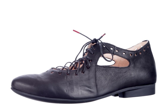 Het Oostenrijkse merk Think! heeft van meet af aan duurzaamheid tot kern van haar productie en bedrijfsvoering gemaakt. Een aantal productielijnen voldoen aan de allerstrengste eco-voorwaarden en zijn ook onderscheiden met het internationale Blue Angel predikaat van de VN: chroomvrij gekleurd leer, geproduceerd zonder chemicaliën en geproduceerd onder goede sociale werkomstandigheden. Goed voor de natuur en voor je voeten. Het zit al in de oproep om te denken (Think!) waarmee klanten worden aangesproken om onafhankelijke wegen te bewandelen.  Dit opengewerkte veterschoentje is inmiddels een klassieker en zien we iedere zomer graag terugkomen. Dit jaar in cognac- en zwart-, zwart/wit  leer en in gevlochten naturel combinatie.