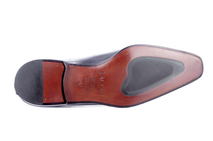 Meer dan 100 jaar vakmanschap komt samen in de stijlvolle herenschoenen van Laccio uit Napoli. De prachtige Italiaanse snit is behouden maar de pasvorm is aangepast aan de voeten van de Nederlandse man. De liefde voor schoenen zie je ook duidelijk aan de zool, perfect afgewerkt en met spijkertjes in de hak. Dit model is heel mooi uitgepoetst en loopt uit naar donkerder tint in de neus, in antraciet en cognac. Exclusief, stijlvol en betaalbaar.